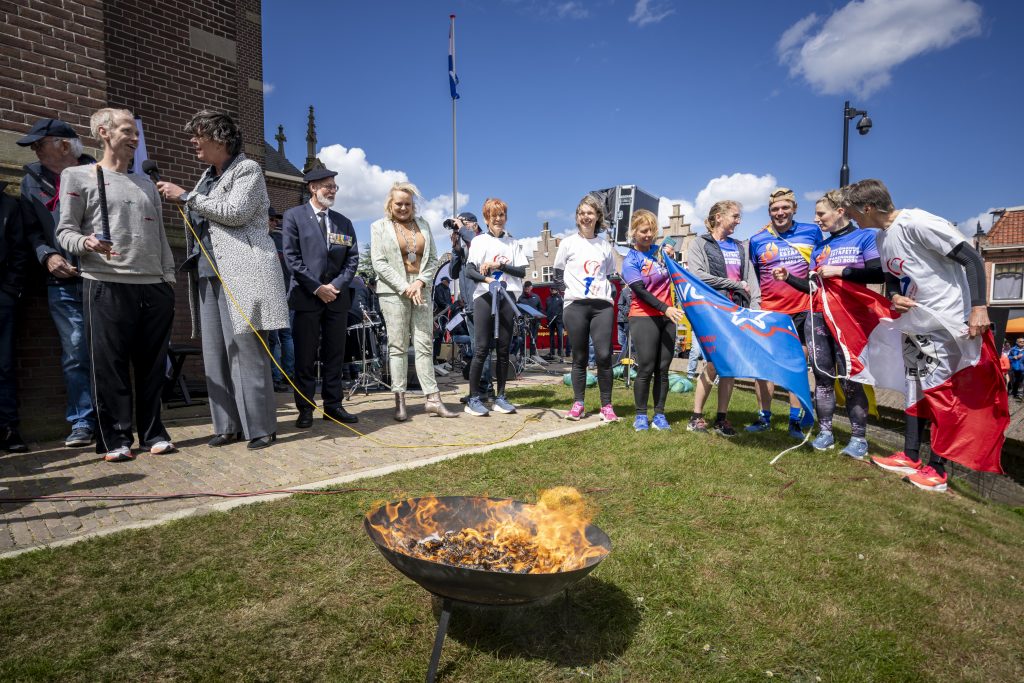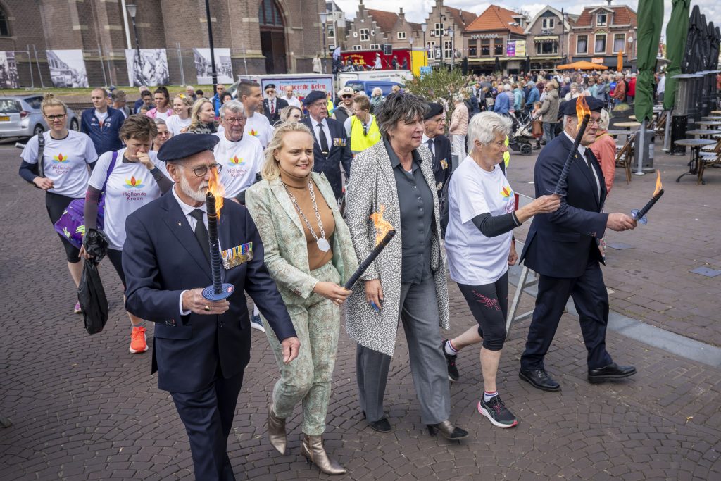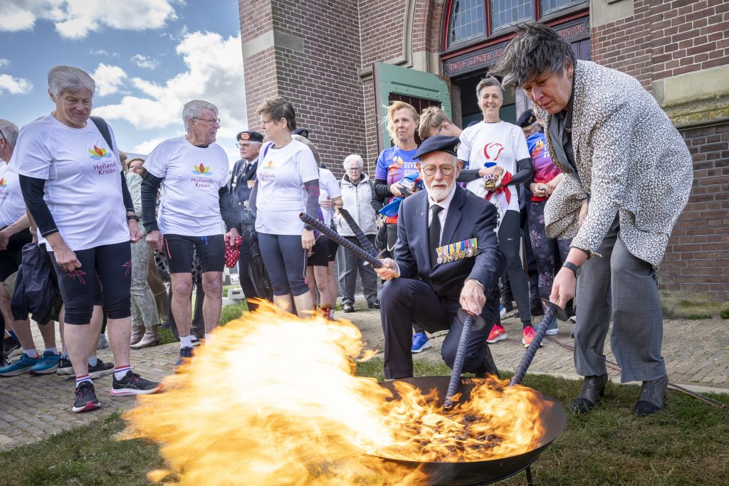 Het vuur in de fakkel symboliseert de bevrijding van Nederland en draagt bij aan de boodschap van vrede en vrijheid.