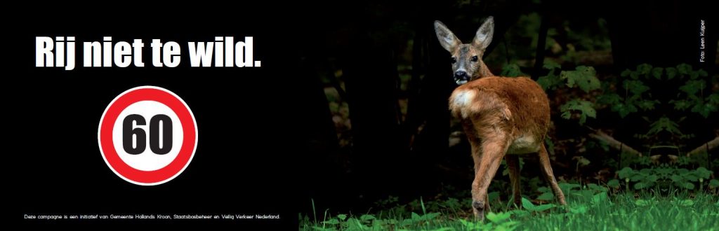 De meeste mensen rijden op deze wegen gelukkig niet harder dan de toegestane snelheid van 60 km/h. Toch rijden sommige automobilisten nog te hard. Elk jaar rijden automobilisten in Hollands Kroon daardoor 12-15 reeën dood. Dat wil niemand natuurlijk op zijn geweten hebben, maar u schrikt ook enorm. Dit is natuurlijk erg vervelend. Wij vragen u namens de dieren om maximaal 60 km/h te rijden.