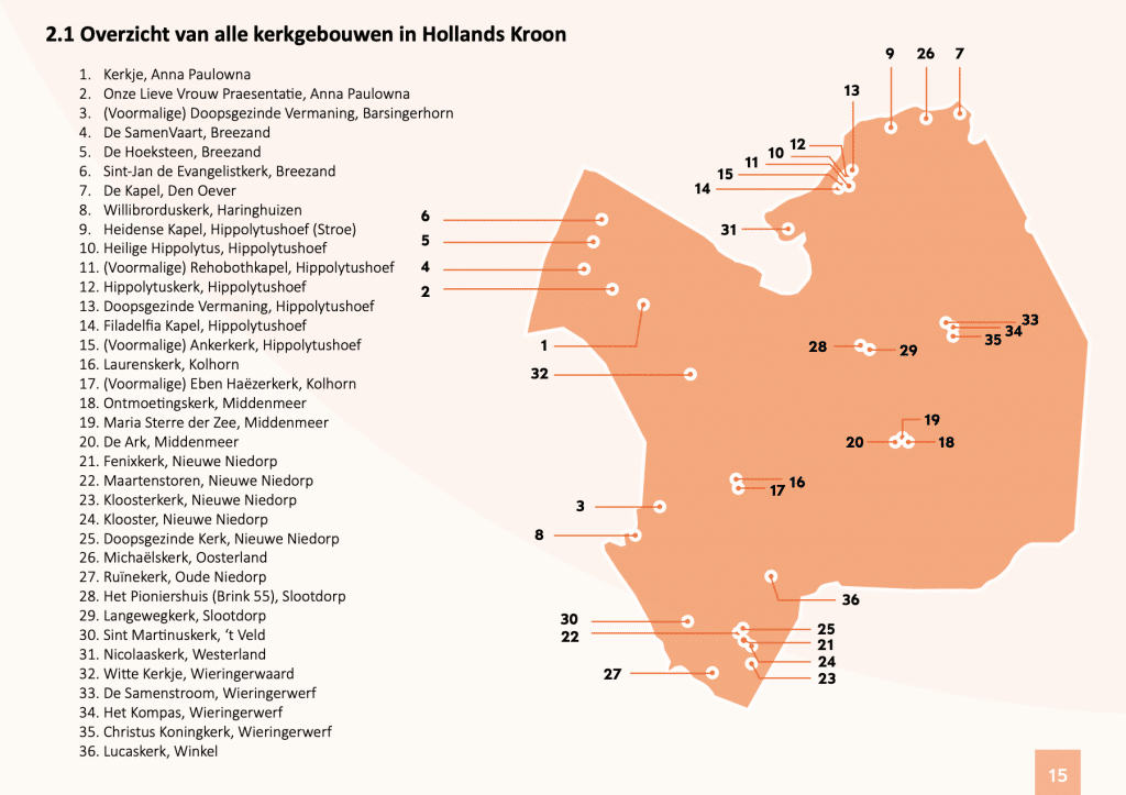 De kerkenvisie geeft een overzicht van 36 religieuze gebouwen in Hollands Kroon. Deze hebben allemaal een eigen kerkenpaspoort. Hiermee is in één oogopslag duidelijk wat de belangrijkste informatie van deze kerk is. Daarnaast vindt u in de visie: