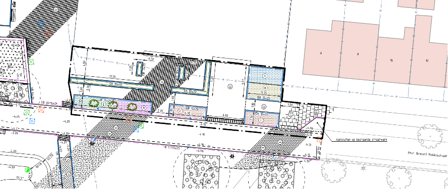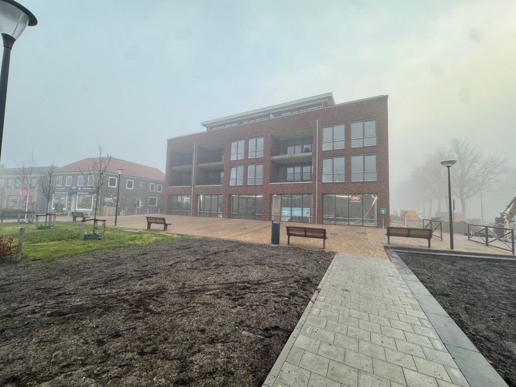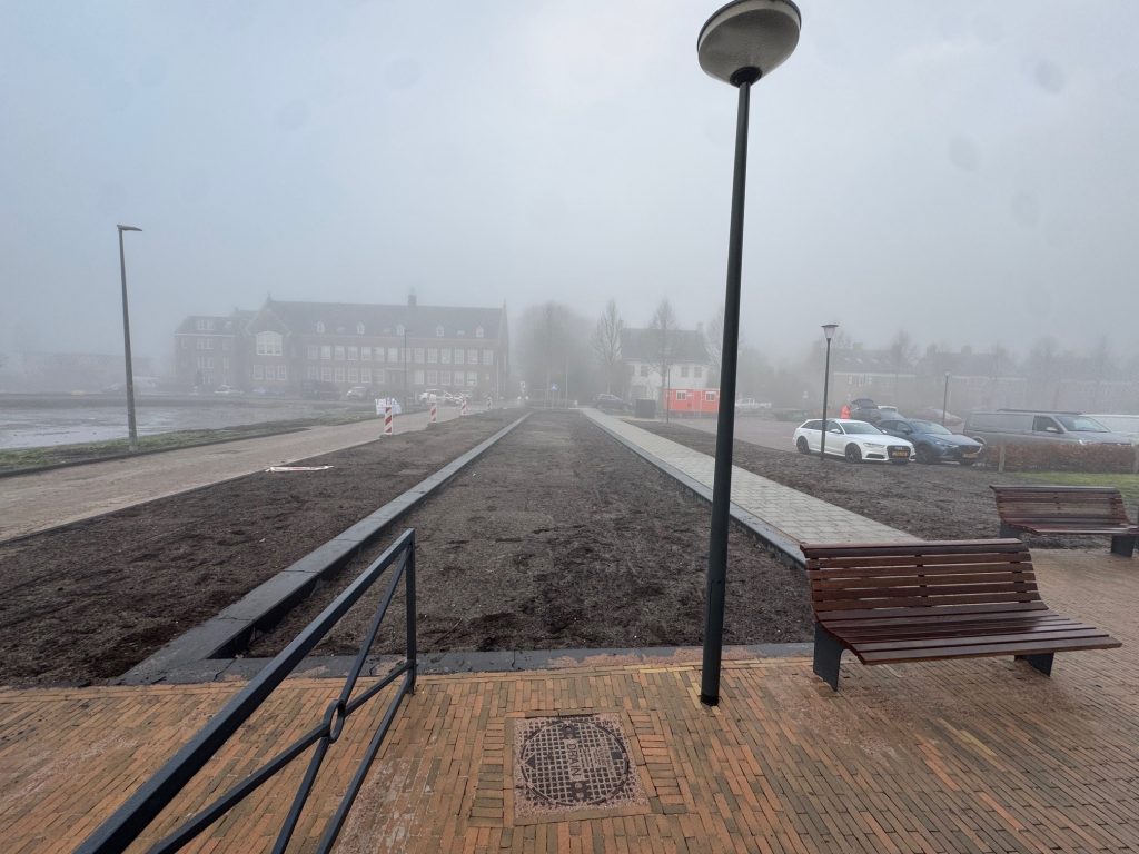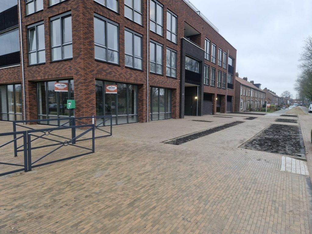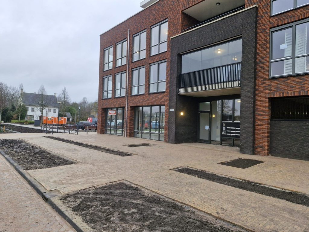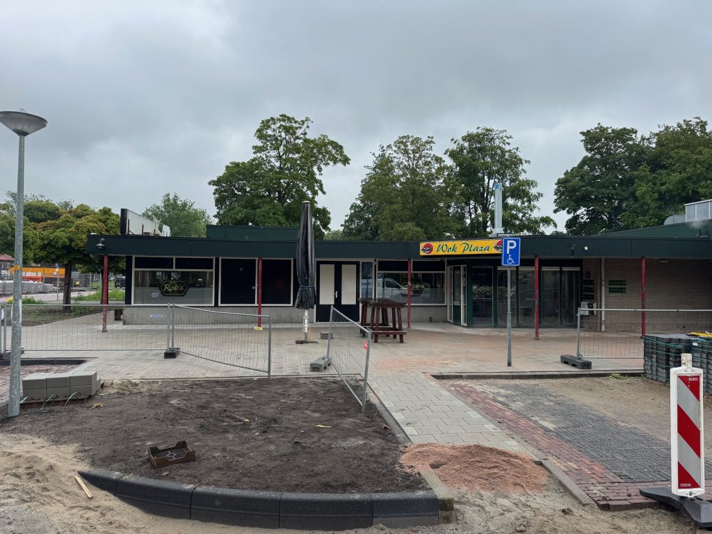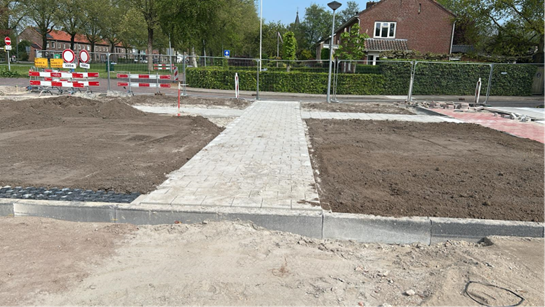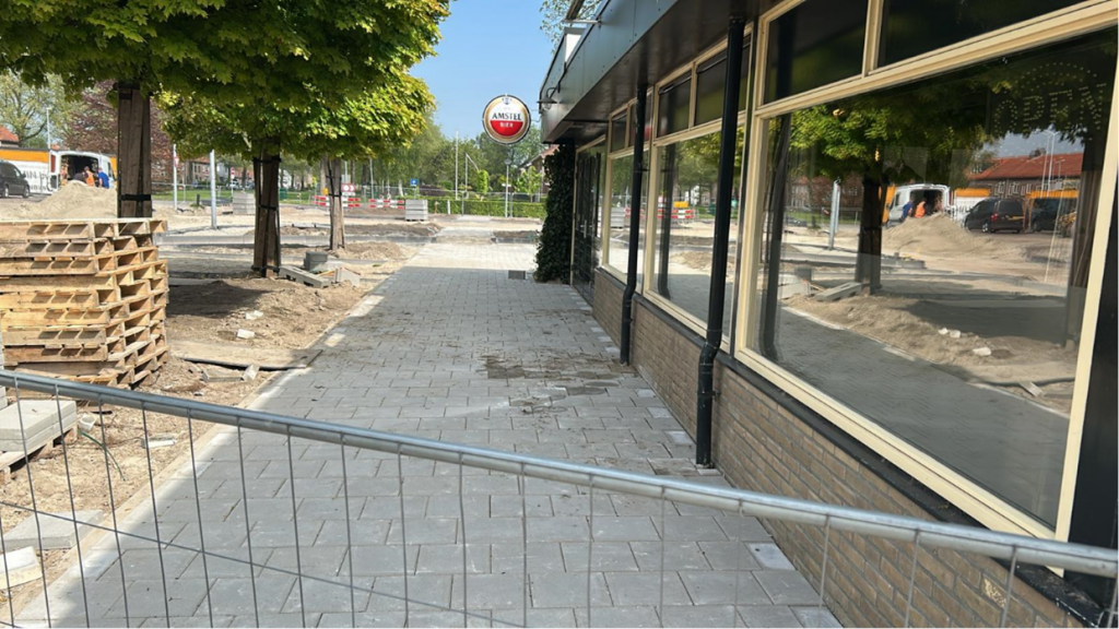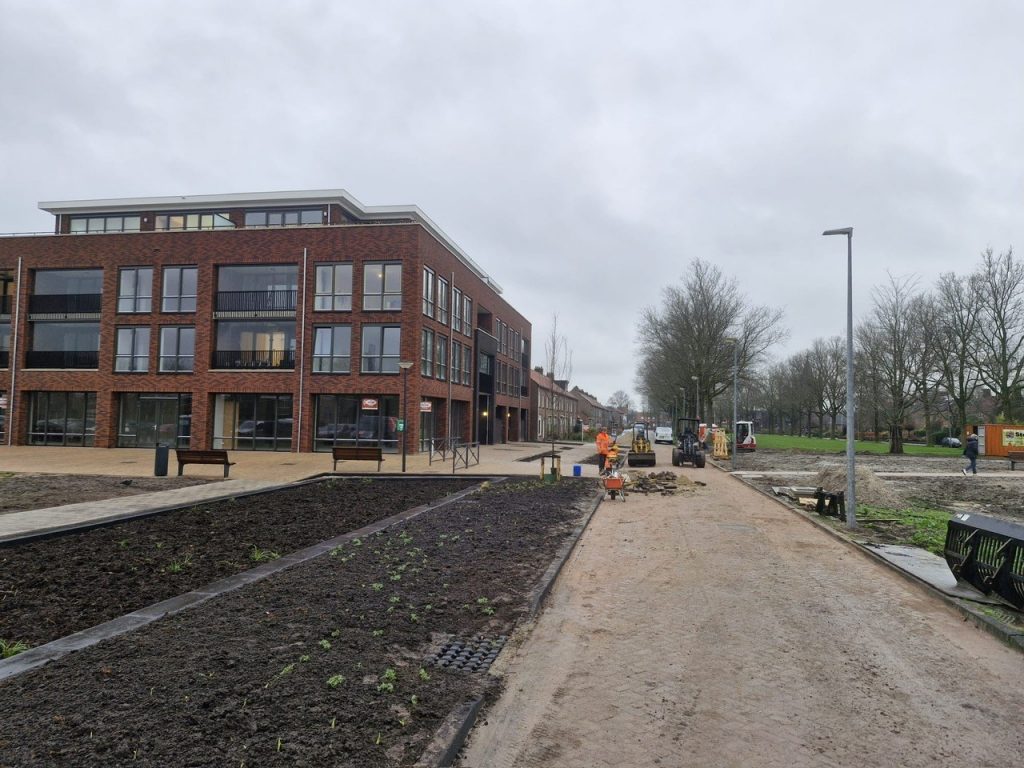 De tegelpaden voor zowel de kledingwinkel, de Action als afscheidshuys Bekema zijn gerealiseerd. Er zijn nieuwe kolken geplaatst voor de afwatering en er is speciale grond aangebracht in de nieuw gemaakte groenvakken waar de bomen worden gepland.