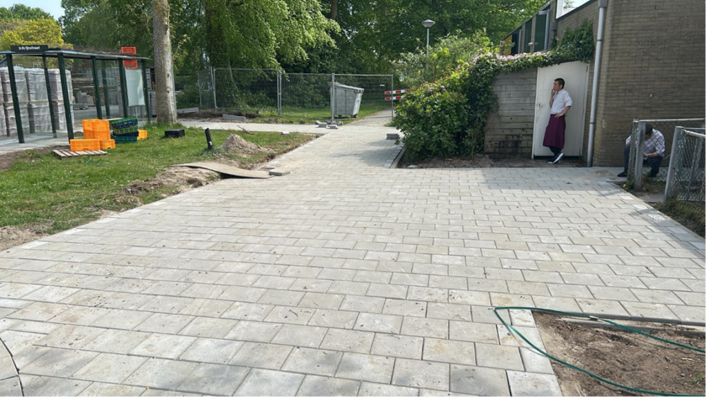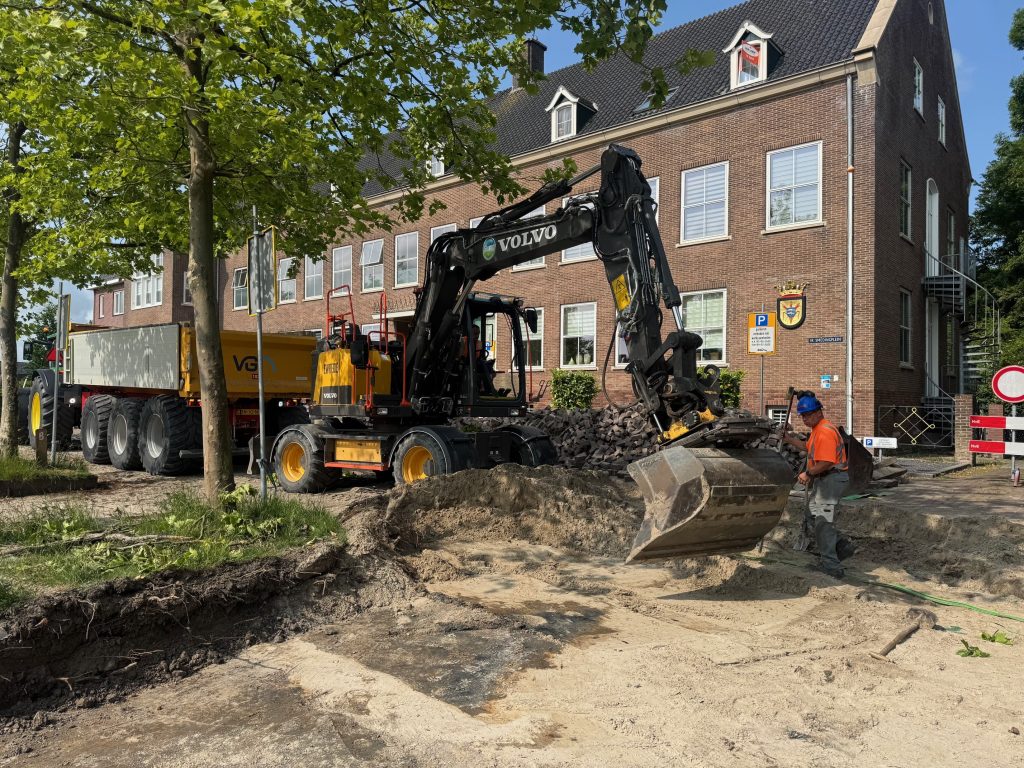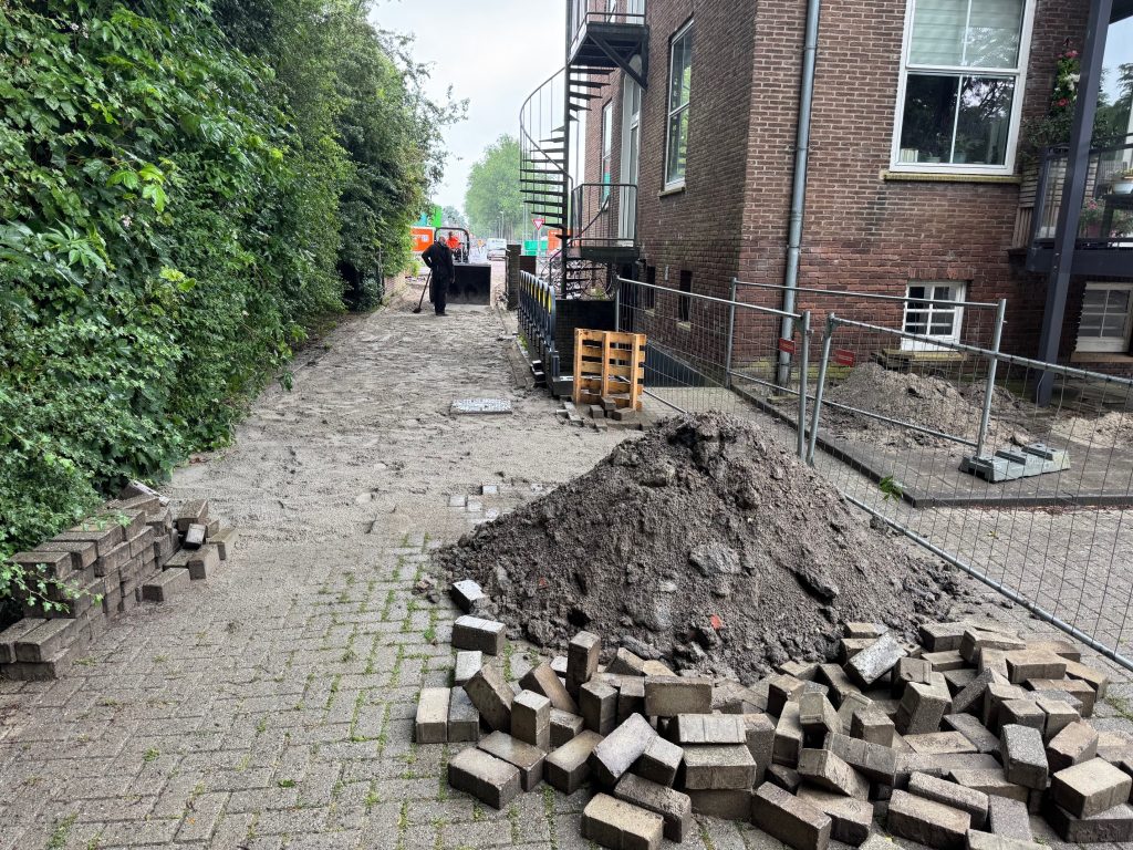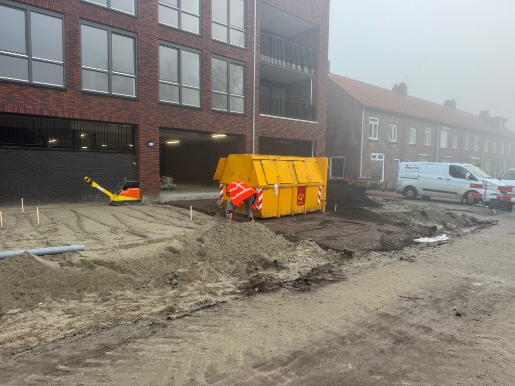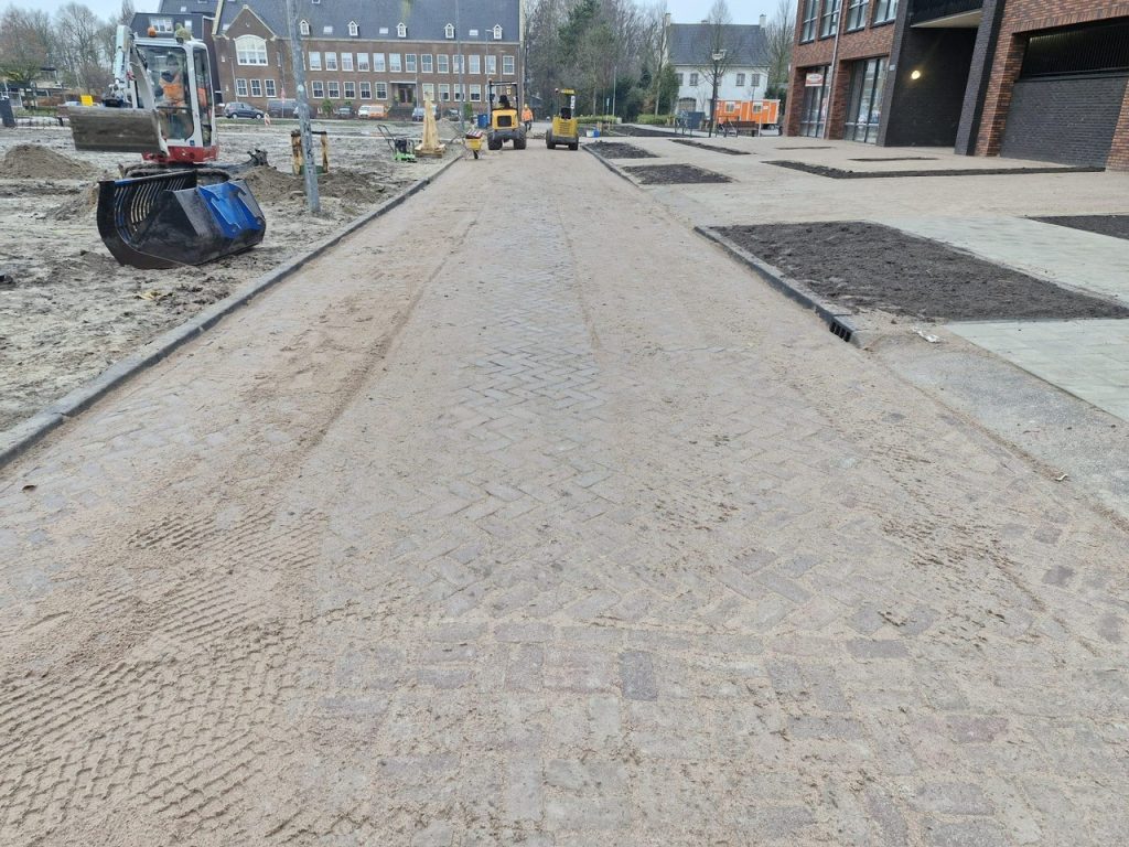De aannemer is aan het aanvullen & voortgang werkzaamheden van de stratenmaker.