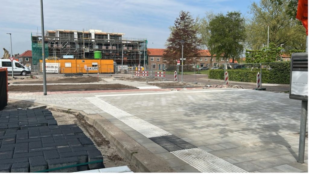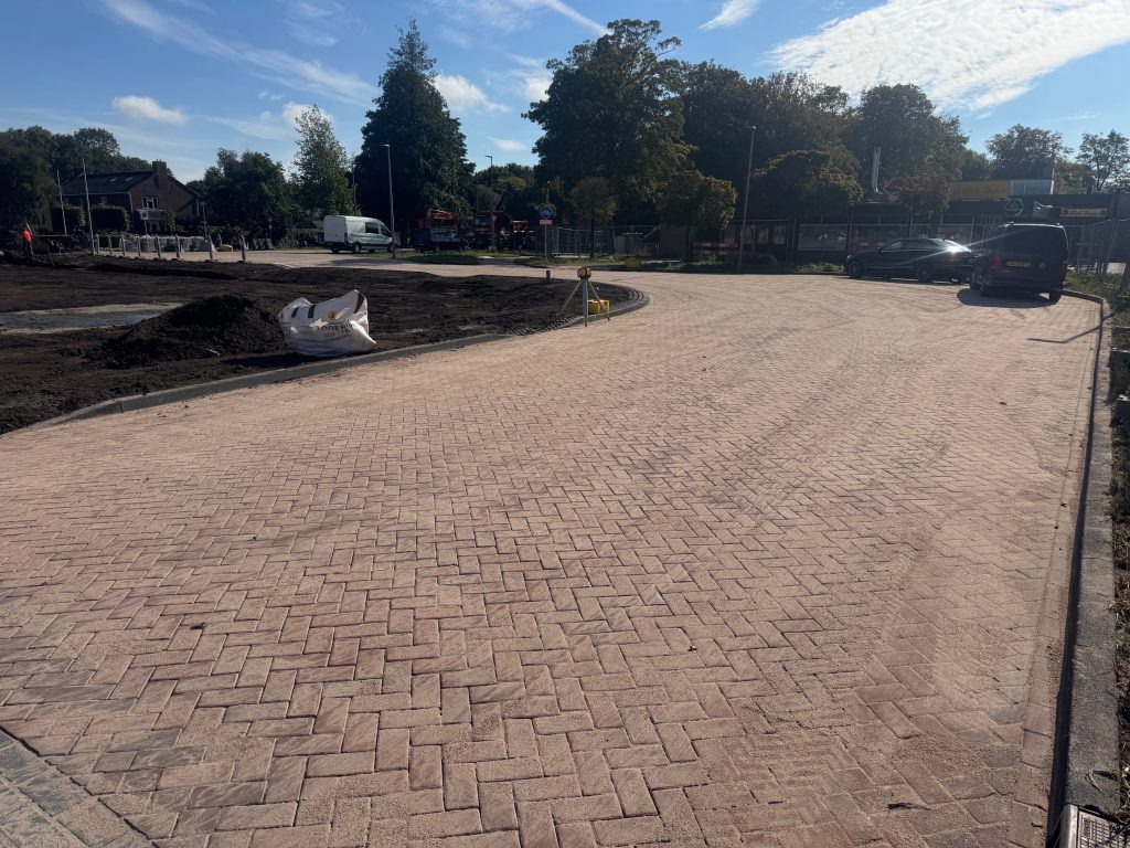 De opsluitbanden zijn geplaatst evenals de grastegels in de bochten. Ook is het tegelwerk rondom de bushalte, het wok restaurant en bij het café gerealiseerd. De contouren van de nieuwe inrichting worden op deze manier goed zichtbaar!