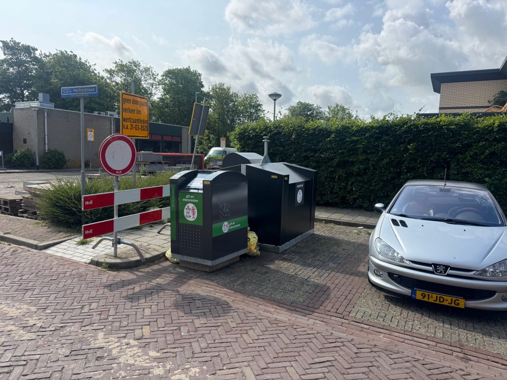 De ondergrondse afvalbakken van beton zijn ook geleverd en staan al op het werk om ingegraven te worden. Dit wordt deze week nog uitgevoerd.