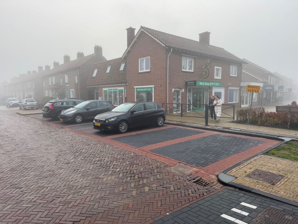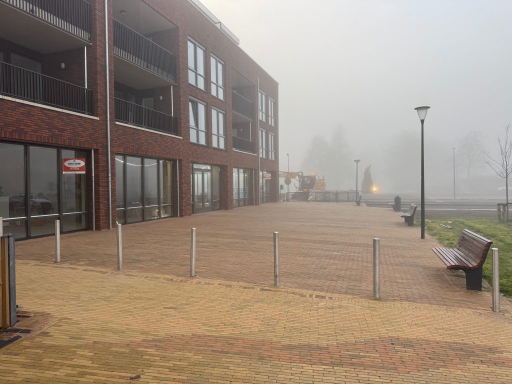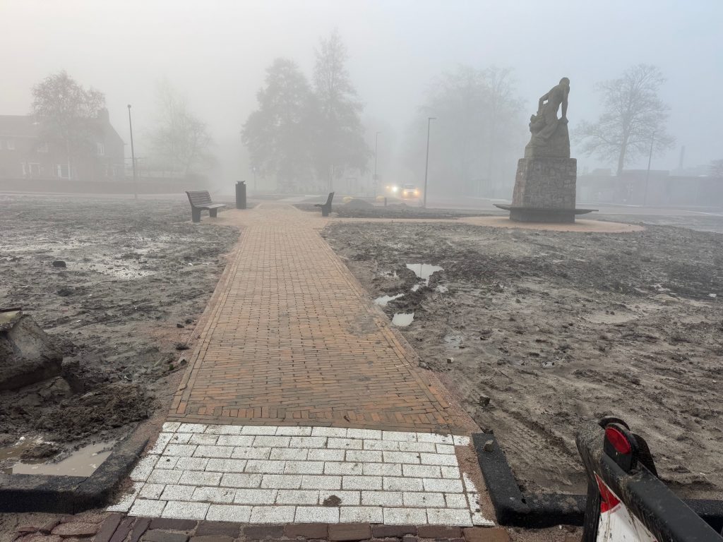 In week 47 zijn de laatste straatwerk werkzaamheden van Fase 1 afgerond. We zijn blij dat dit is gelukt nog voor de feestdagen. Op de foto’s ziet u het resultaat. De aannemer brengt nog tijdelijke belijning aan op het plein voor het maken van 7 tijdelijke parkeervakken. De hekken zijn vastgezet met palen zodat de hekken niet omvallen. Alle toekomstige locaties voor rioolkolkleidingen en de kabels voor de openbare verlichting zijn tijdelijk onder de grond gebracht. De straatstenen zijn schoongeveegd met een veegwagen om het plein weer netjes achter te laten. De verwachting is dat de aannemer in februari of maart verder gaat met het herinrichten van het plein en het maken van de tijdelijke parkeerstrook langs het standbeeld.