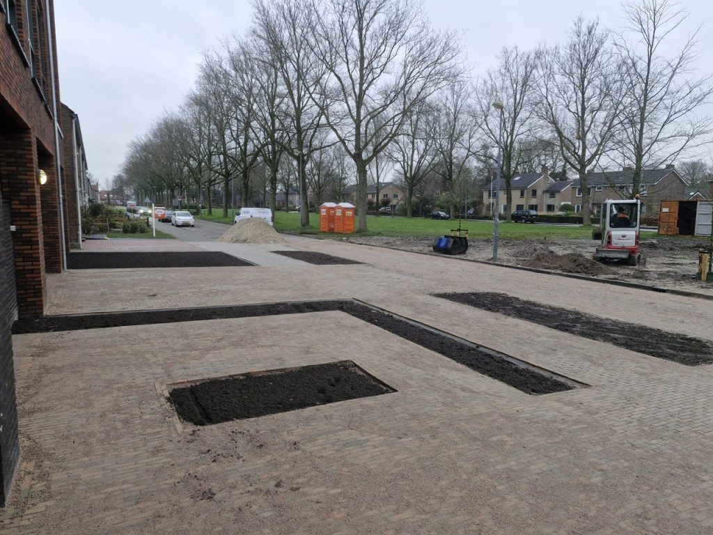 Alle boomplantgaten zijn ontgraven en er is ontluchting voor de bomen geplaatst en aangevuld met teelaarde.