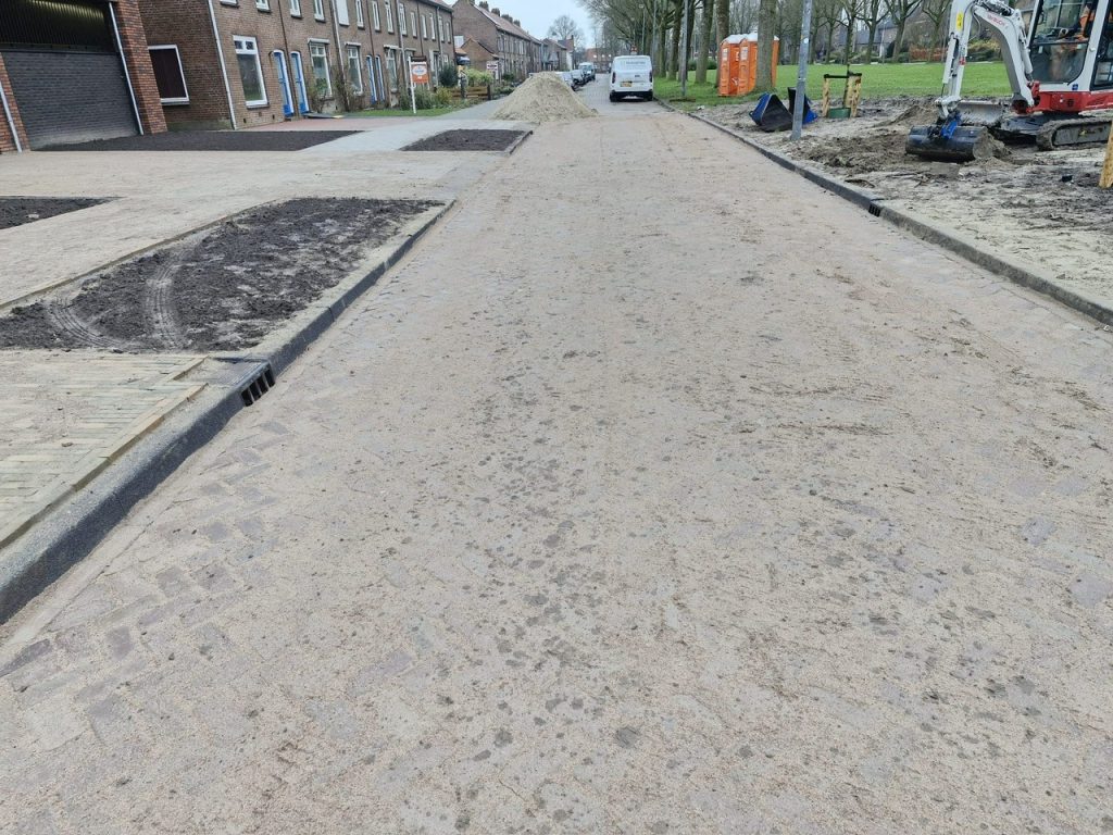 Het nieuwe riool is aangebracht en geïnspecteerd, hierna is verder gegaan met de opbouw van de weg. Het menggranulaat is aangebracht en de kolken zijn geplaatst.